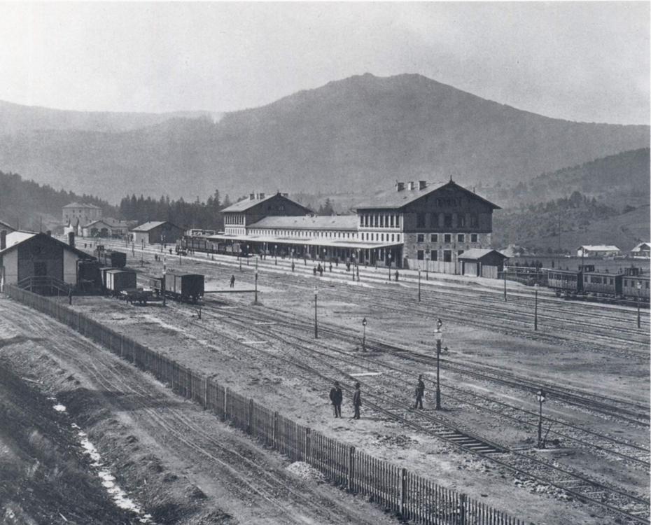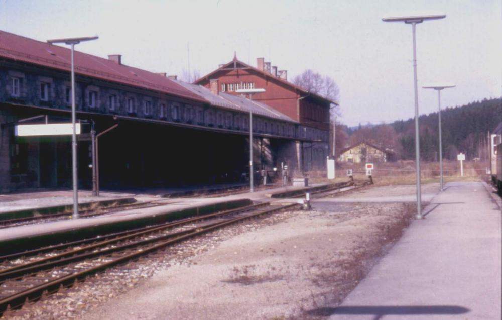 Bhf. Bayerisch Eisenstein Bahn-km 134,560 Bayerisch Eisenstein von böhmischer Seite vor 1900 Der Bahnhof Eisenstein wurde als Grenzbahnhof zwischen Bayern und Österreich-Ungarn erbaut. Nach 3 Jahren Bauzeit wurde er 1877 eröffnet. Der Bahnhof war seinerzeit allein auf bayerischer Seite größer als der danebenliegende Ort. Die Anlage auf österreichischer Seite hatte ähnliche Ausmaße. Der Bahnhof war Grenzstation und Gemeinschaftsbahnhof der Bayerischen und Böhmischen Staatsbahn. Die Grenz geht quer durch den Bahnhof. Im Mittelteil des Bahnhofsgebäudes befindet sich ein Grenzstein. Sehenswert ist auch der große Saal der Bahnhofsgaststätte. Nach 1945 wurde nur die bayerische Seite genutzt. Da nach dem Krieg vielen Berliner im Bayerisch Wald Urlaub machten, fuhren vom Bahnhof Zoo Kurswagen nach Bayerisch Eisenstein und zurück. Es bestanden Pläne der DB die gesamte Strecke stillzulegen. |