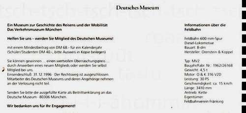 Die Feldbahn Fränking gab später keine weiteren Fahrkarten heraus, da vor Ort kein öffentlicher Fahrbetrieb stattfand. 2005 wurde von uns der Standort in Fränking aufgelöst und der Verein 2006 im Vereinsregister gelöscht. Der Nachfolgeverein ist die Feldbahn in Riedlhütte. |