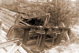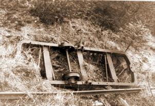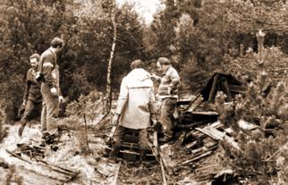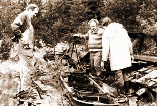Im April 1988 in Peiting ein umgekippter Brotzeitwagen der Torfarbeiter Besichtigung weiterer Wagen des Zuges, wir brauchen nur die Fahrgestelle |