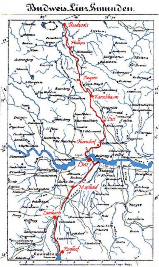 Hinweise für Spaziergänger auf der Bahntrasse der Pferdeeisenbahn Budweis–Linz–Gmunden Die Pferdeeisenbahn Budweis-Linz-Gmunden war die erste öffentliche Eisenbahnlinie auf dem europäischen Festland und wurde zwischen 1827 und 1836 abschnittsweise eröffnete. In den Jahren 1855 und 1856 wurde die Bahn zwischen Linz und Gmunden auf Dampfbetrieb umgestellt. Auf der gebirgigen Strecke zwischen Linz und Budweis (České Budějovice) war diese Umstellung aufgrund zu enger Krümmungsradien und zu großer Steigungen nicht möglich. Deshalb wurde bis 1873 eine Ersatzstrecke mit meist anderer Trassenführung zwischen Linz und Budweis errichtet, die anschlie0end den Dampfbetrieb zuließ. Der Pferdebahnbetrieb wurde im Dezember 1872 eingestellt. Die ursprüngliche Strecke war noch feldbahnartig. |