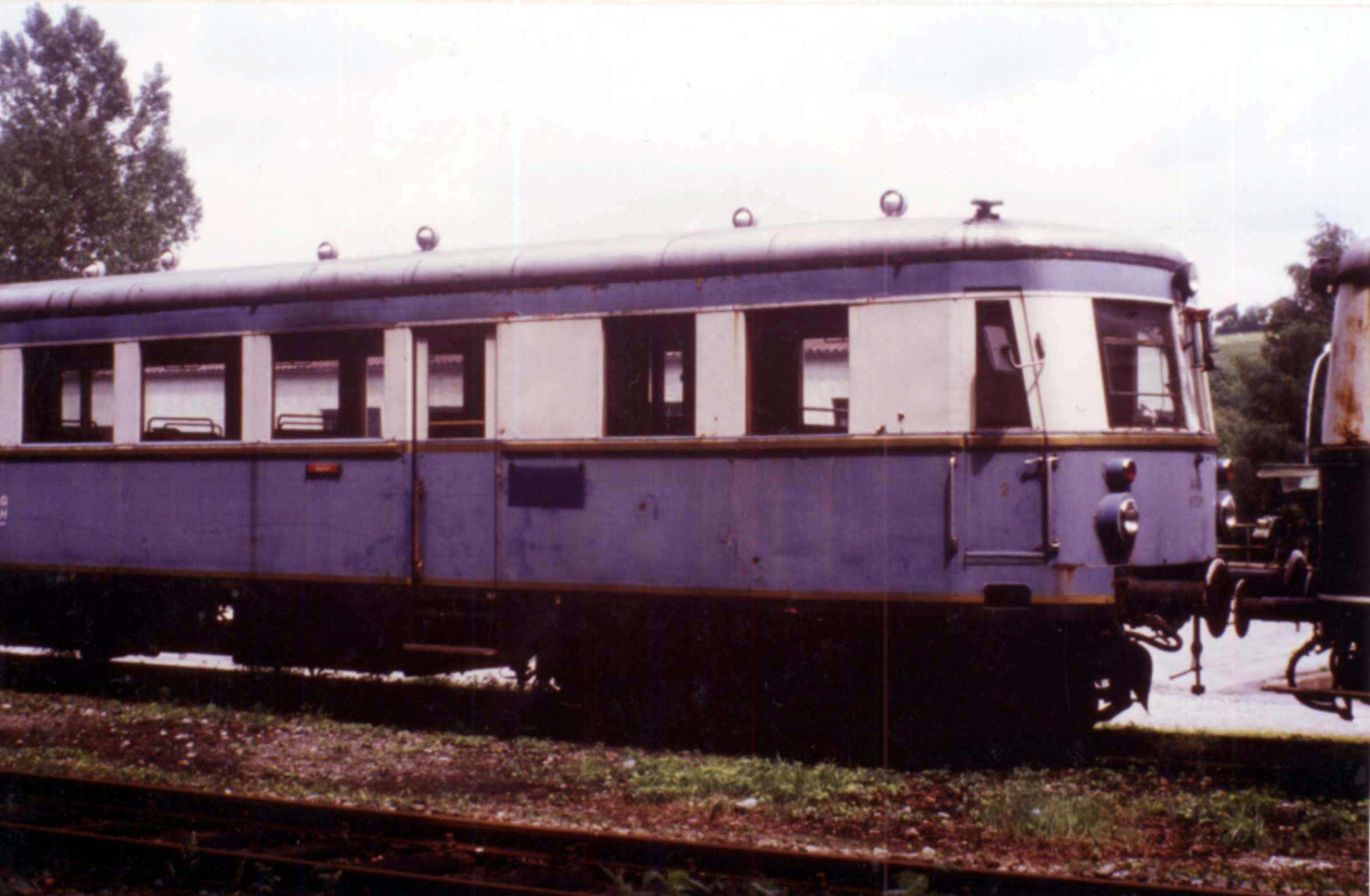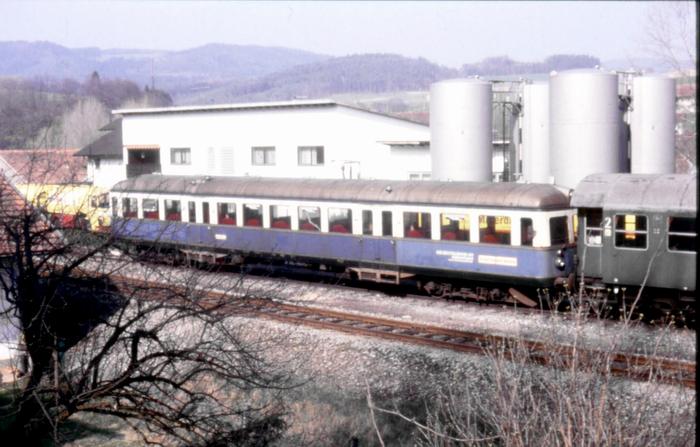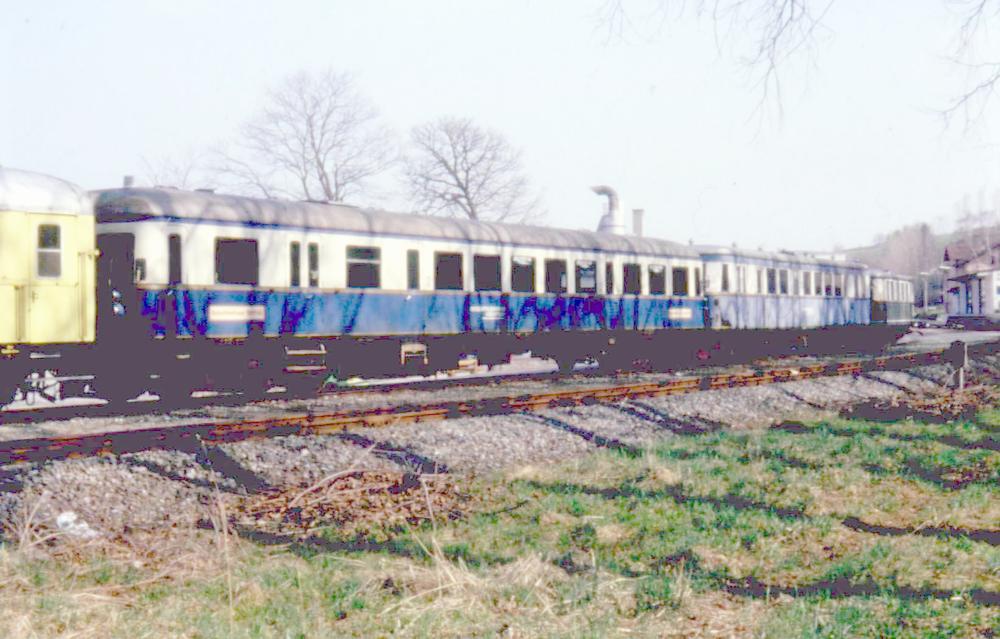 Abgestellte Triebwagen und Wagen neben dem Hauptgleis Richtung Blaibach