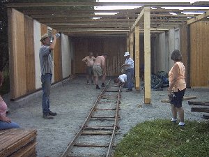 Bau des Lokschuppens Die Wände stehen, das Dach fehlt, aber die erste Lok steht in dem Schuppen und das muss gefeiert werden.
