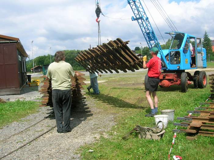 Truck mit der Lok vorgefahren und die Gleisrahmen von diesem mit dem Bagger