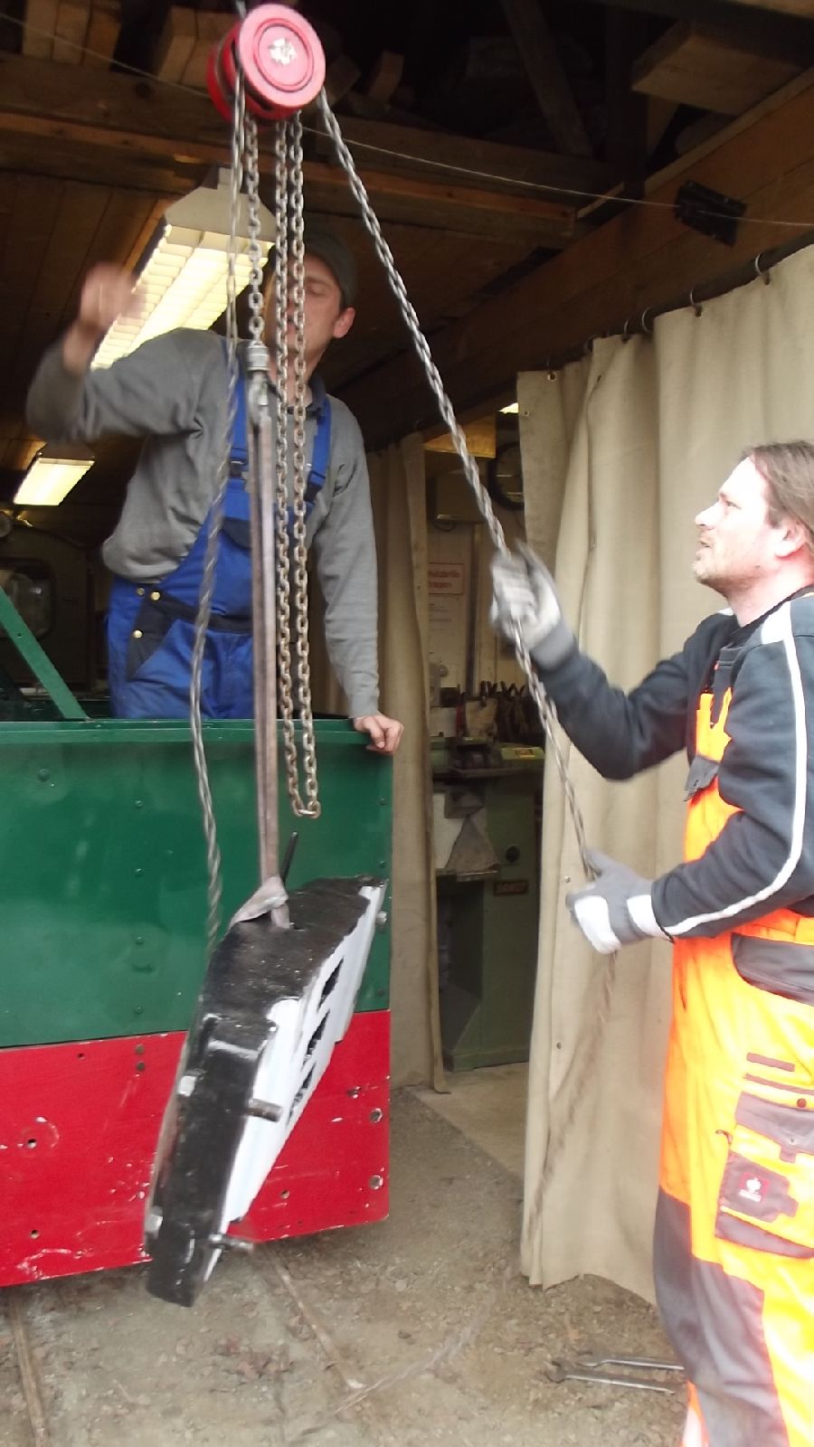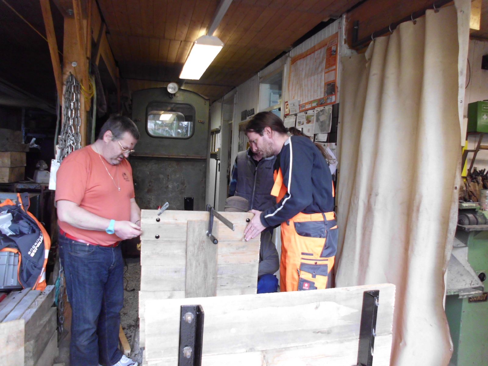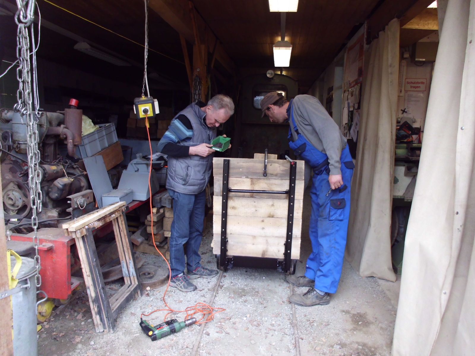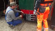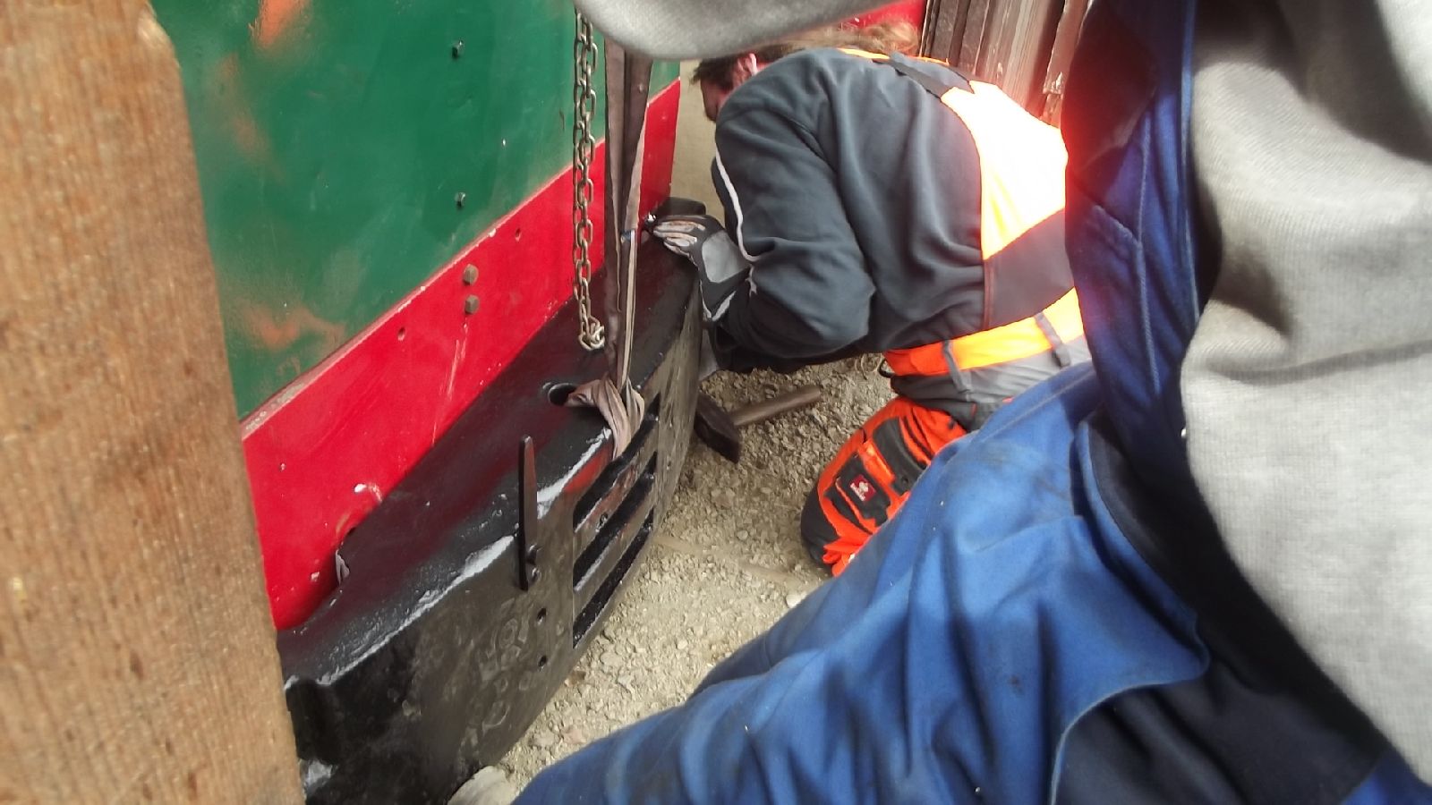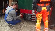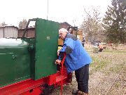 → Am 5. April wurde gearbeitet. An der Gmeinder wurden die fehlenden Pufferbohlen montiert. Dabei stellte sich heraus das diese unterschiedlich gebohrt waren und deshalb nicht vertauscht montiert werden konnten. Die Bohlen hingen sonst schief an der Lok. |