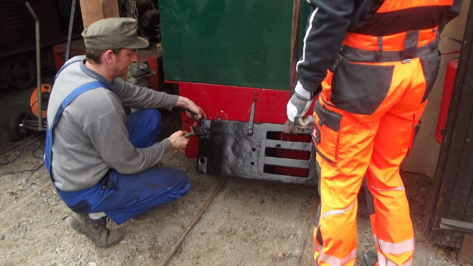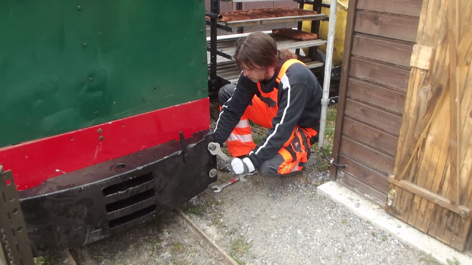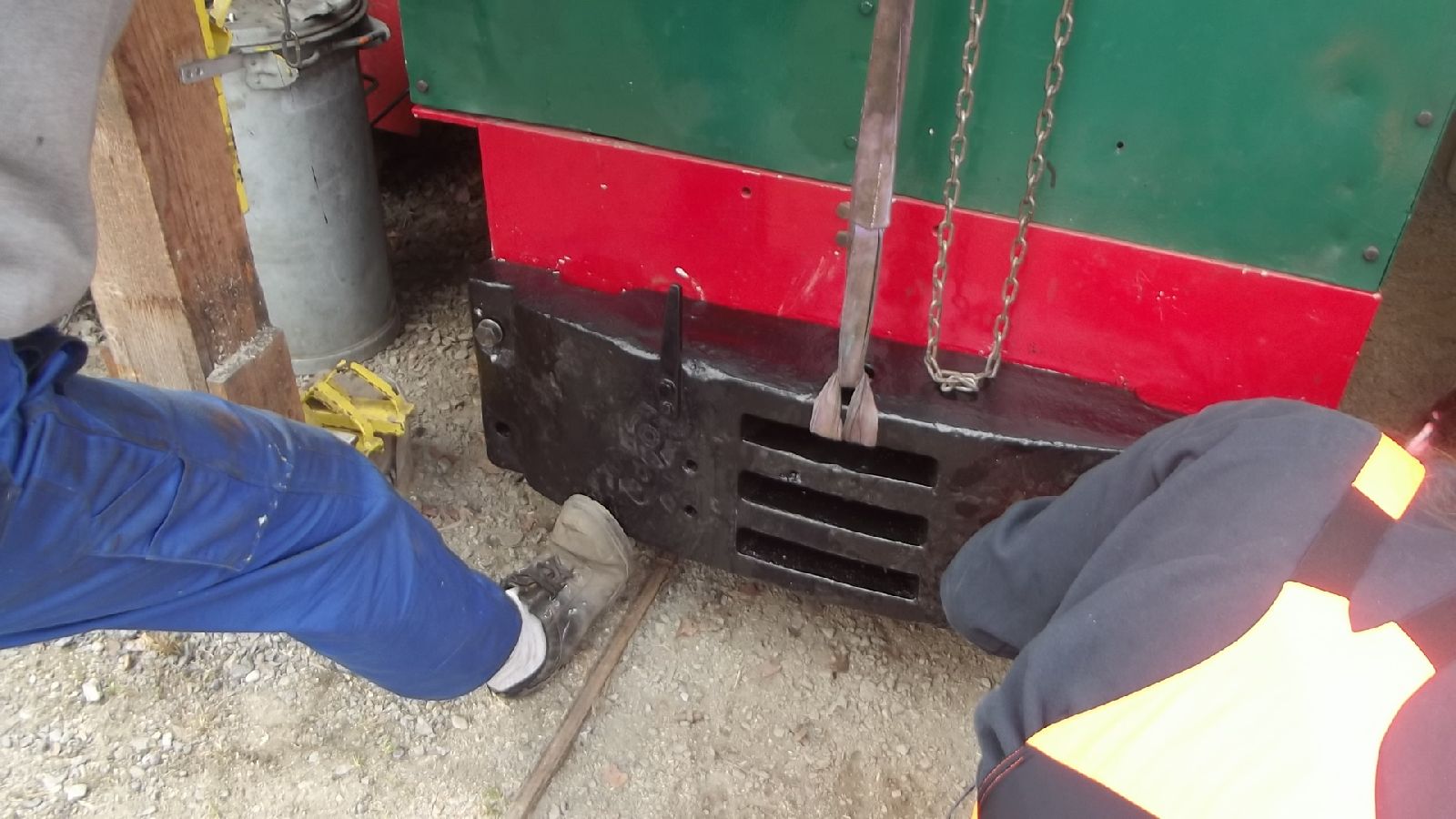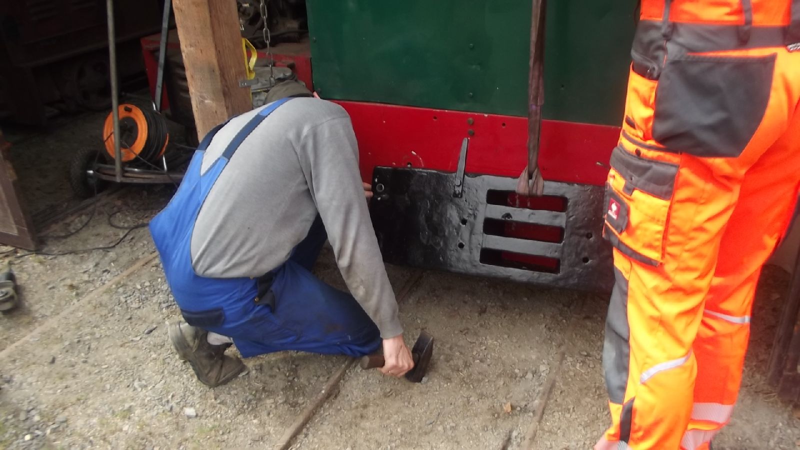 → Am 5. April wurde gearbeitet. An der Gmeinder wurden die fehlenden Pufferbohlen montiert. Dabei stellte sich heraus das diese unterschiedlich gebohrt waren und deshalb nicht vertauscht montiert werden konnten. Die Bohlen hingen sonst schief an der Lok. |