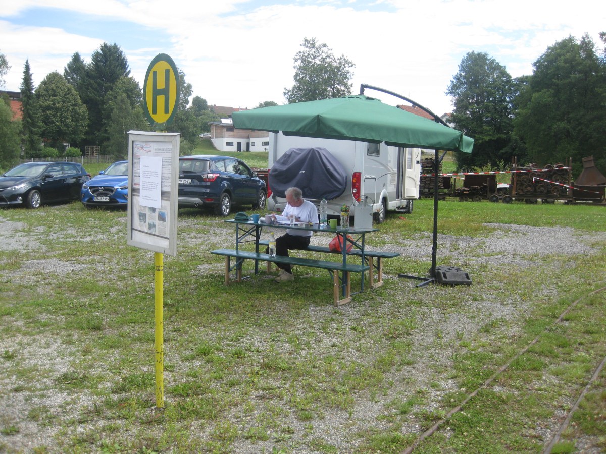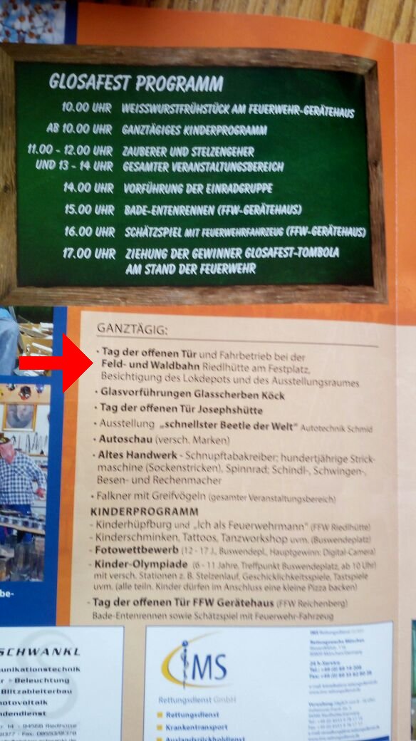 → Der Verein ist mit viel Personal erschienen. Wenige Tage zuvor war uns jedoch der Fahrbetrieb zum Glosafest mit der Begründung, wir hätten keine Betriebsgenehmigung, nach dem Bayerischen Eisenbahn- und Seilbahngesetz, untersagt worden. In der Genehmigung des Festes waren wir jedoch enthalten und in den Prospekten war der Fahrbetrieb angekündigt. Einige Mitglieder hatten sich für die Veranstaltung extra freigenommen und wir waren mit rund 13 Personen anwesend. Leider sind wir kein Eisenbahnunternehmen nach dem angegebenen Gesetz. Nun wird die Sachlage vom übergeordneten Landratsamt geprüft. |
