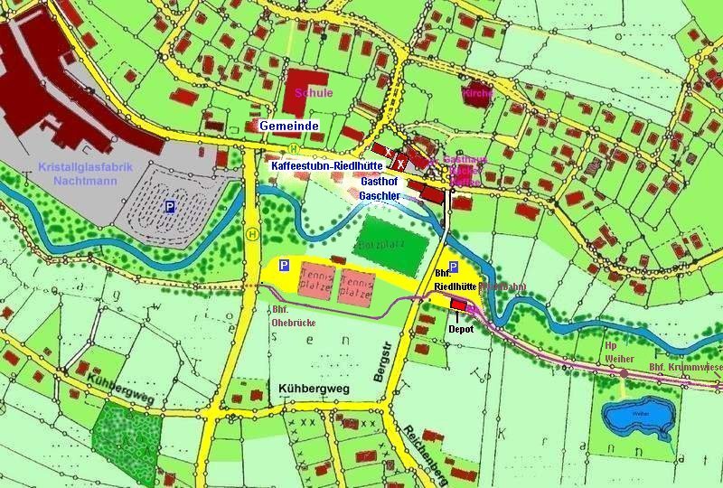 Tennisplätze bis zur ehm. Festwiese. Hier befindet sich der Bhf. Riedlhütte