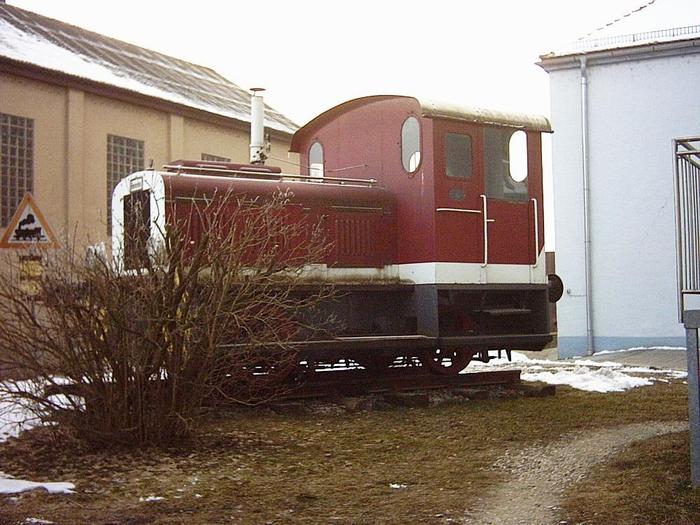 Denkmallokomotiven in Deggendorf Werklok Nr. 1 Gmeinder Fabrik-Nr. 3668 Bj. 1943 Typ 100 PS Bauart B-dm Im Deggendorfer Wallnerhafen befindet sich diese Denkmallokomotive. Sie steht direkt vor dem Eingang der Schiffsmeldung, dem Verwaltungsgebäude des Zweckverbandes Donau-Hafen. Sie stammt noch aus der Zeit der Wallner Werft und wurde direkt an die Firma Josef Wallner, Bayerische Schifffahrts- & Hafenbetriebs-GmbH in Deggendorf ausgeliefert Nach dem sie rund 60 Jahre im Einsatz war, wurde sie im Jahr 2002 als Denkmal aufgestellt. Ursprünglich war die Lok grün lackiert. In seinem Buch über die Nebenbahn Deggendorf - Eging beschreibt Bernhard Rückschloß auch den Hafenbahnbetrieb Werklok Tante Emma |